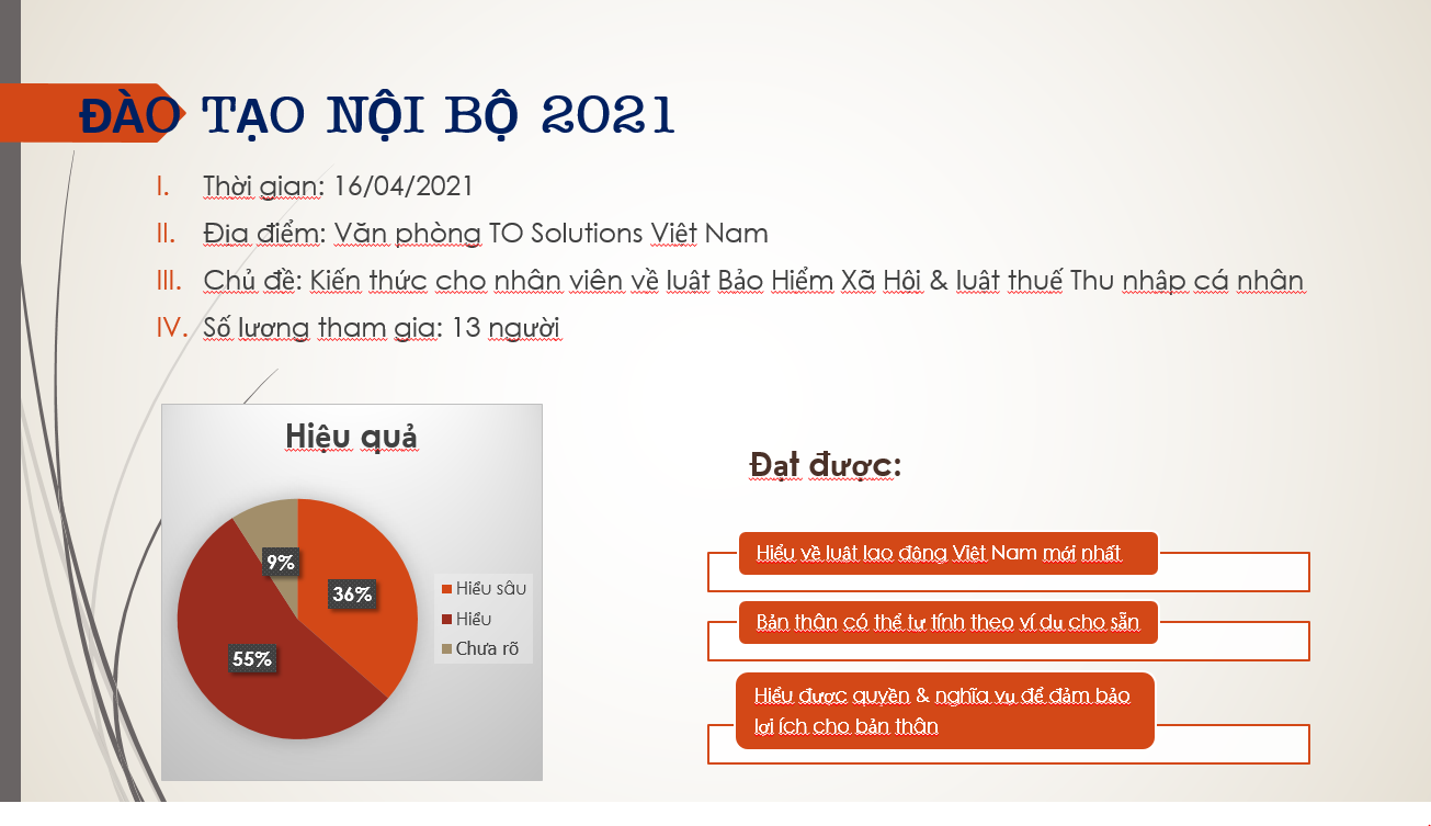 Thông qua chương trình, trên 90% nhân viên được đào tạo hiểu về cách thức tính, quyền và nghĩa vụ của bản thân, quyền và nghĩa vụ của công ty và các quy định hiện hành mới nhất.