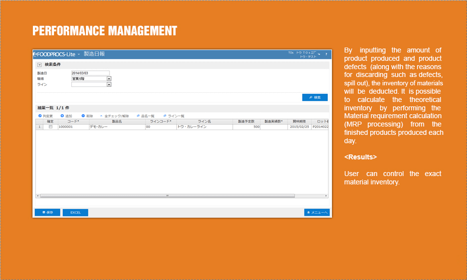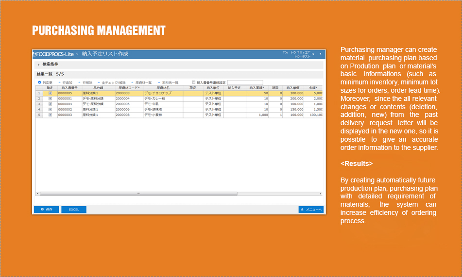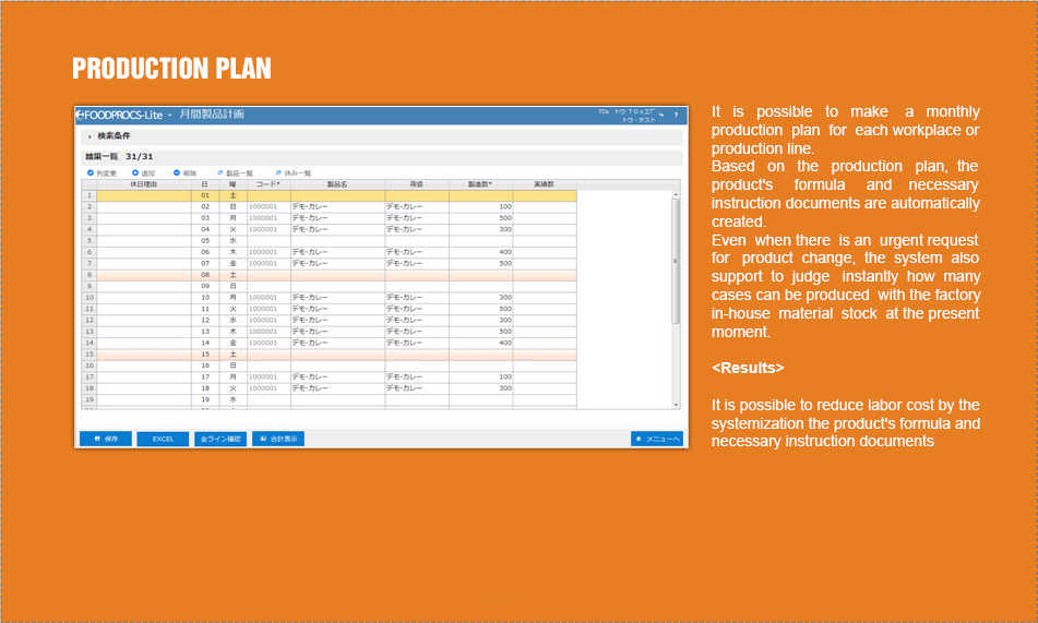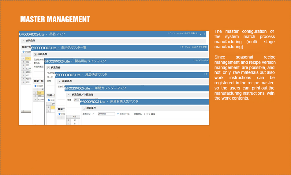 Before FOODPROCS-Lite was deployed, it was complicated to change excel formulas of manufacturing instructions. After implementation, just by registering data master at Production Management System, it not only shorten the time to register manufacturing instructions, but also avoid mistakes.