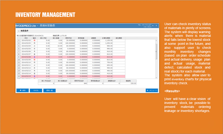 Before FOODPROCS-Lite was deployed, putting data into excel is complicated and mistakes are easily passed unnoticed. There are many problems such as lacking purchase order or wrong quantity order, expired materials loss caused by over stock or wrong order, material shortage. However, with the implementation of Production management system, inventory management and ordering work became easier, and food waste was also reduced.