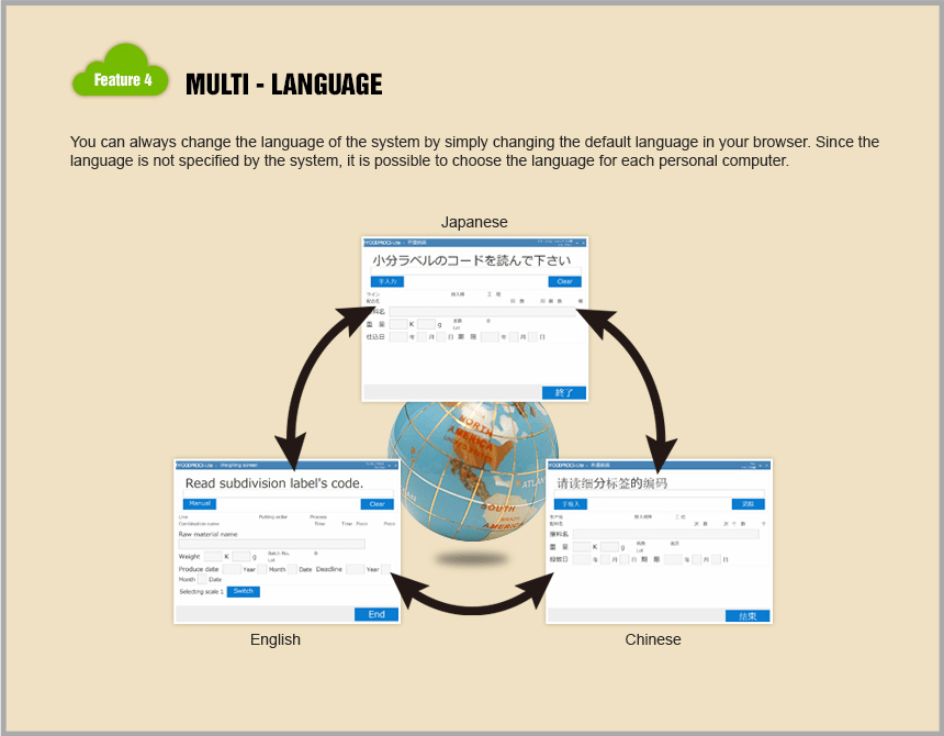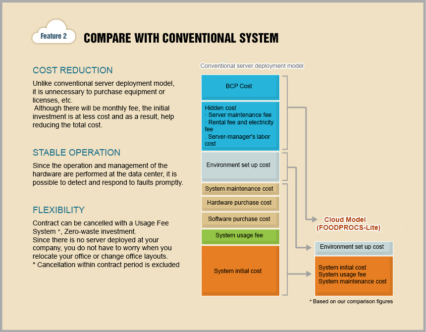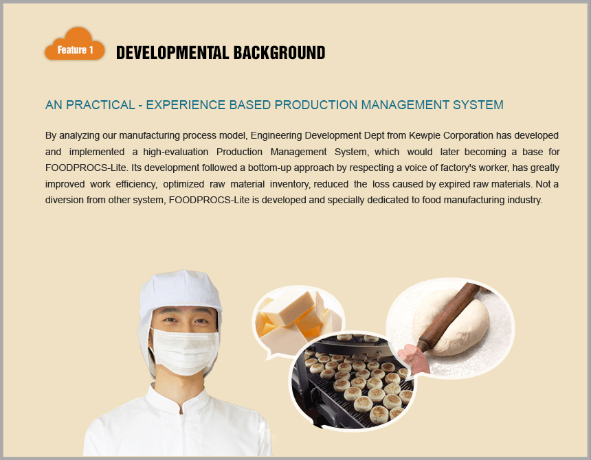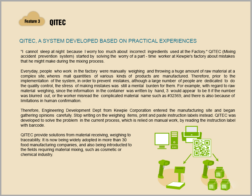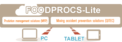 We have customized FOODPROCS, a system used in 90 domestic and foreign factories of Kewpie Corporation, to proudly introduce an easy-to-use, easy-to-implement system, FOODPROCS-Lite. And by bringing the essential management functions necessary for factory, and Mixing accident prevention solutions (QITEC) into the Cloud service, we are able to support our clients to significantly reduce initial costs and have a better operability.