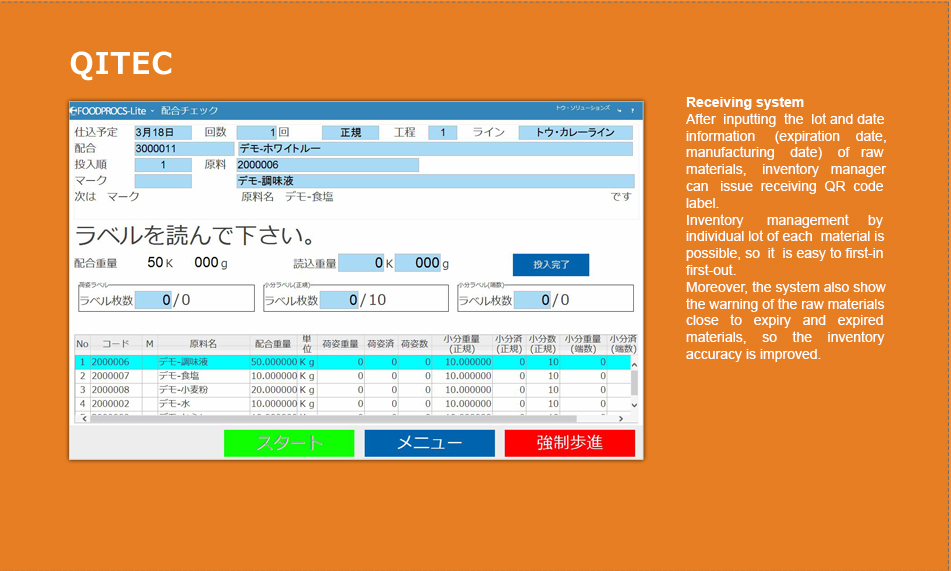 Before FOODPROCS-Lite was deployed, since factory workers have to check the material mixing checklist in paper, and it would cause a huge mental burden for them to make sure everything is done without mistake. The waste loss when mistake occurred could reach several millions yen a year. Thank to Mixing accident prevention solutions (QITEC), the mixing mistakes cause by wrong recipe or expired materials have become zero. Food waste due to mixing mistakes also became zero
